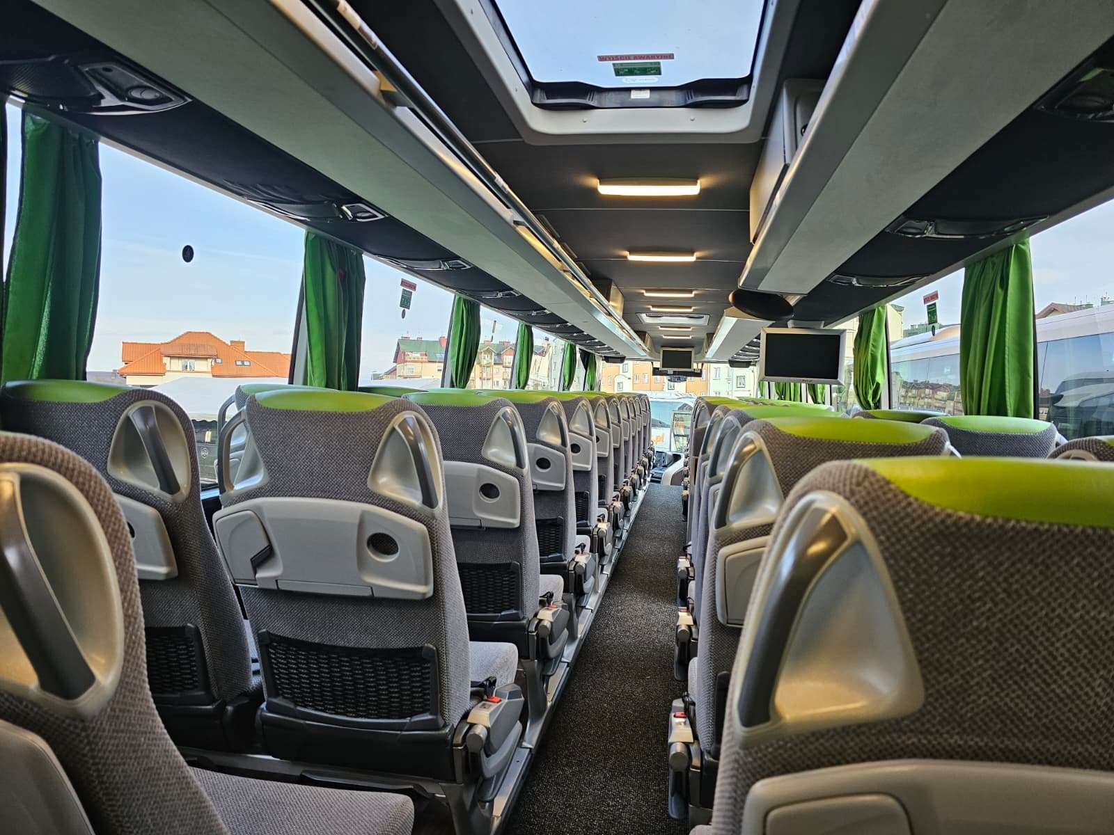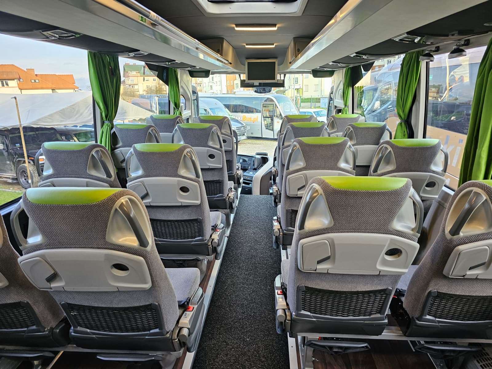 W autokarze znajduje się klimatyzacja o wysokiej wydajności, regulowane fotele z dużą przestrzenią na nogi, indywidualne nawiewy, porty USB, Wi-Fi oraz toaleta – wszystko, czego potrzebuje grupa w podróży służbowej, pielgrzymce, wyjeździe integracyjnym czy wakacyjnym tourze po Europie. Duże bagażniki umożliwiają komfortowe przewiezienie walizek i sprzętu.